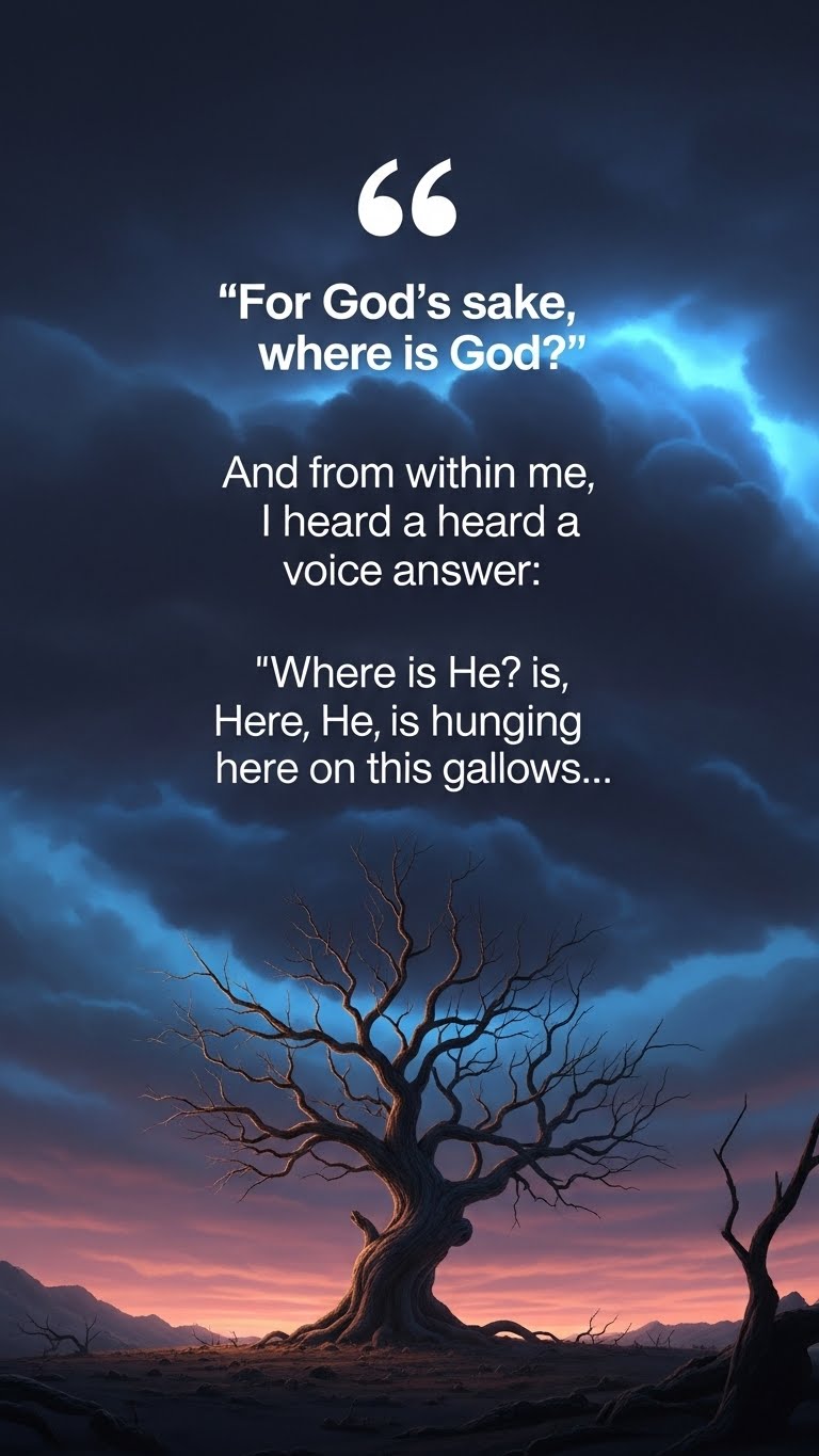 "Where is God now?" And I heard a voice within me answer him: "Where is He? Here He is—He is hanging here on this gallows..."